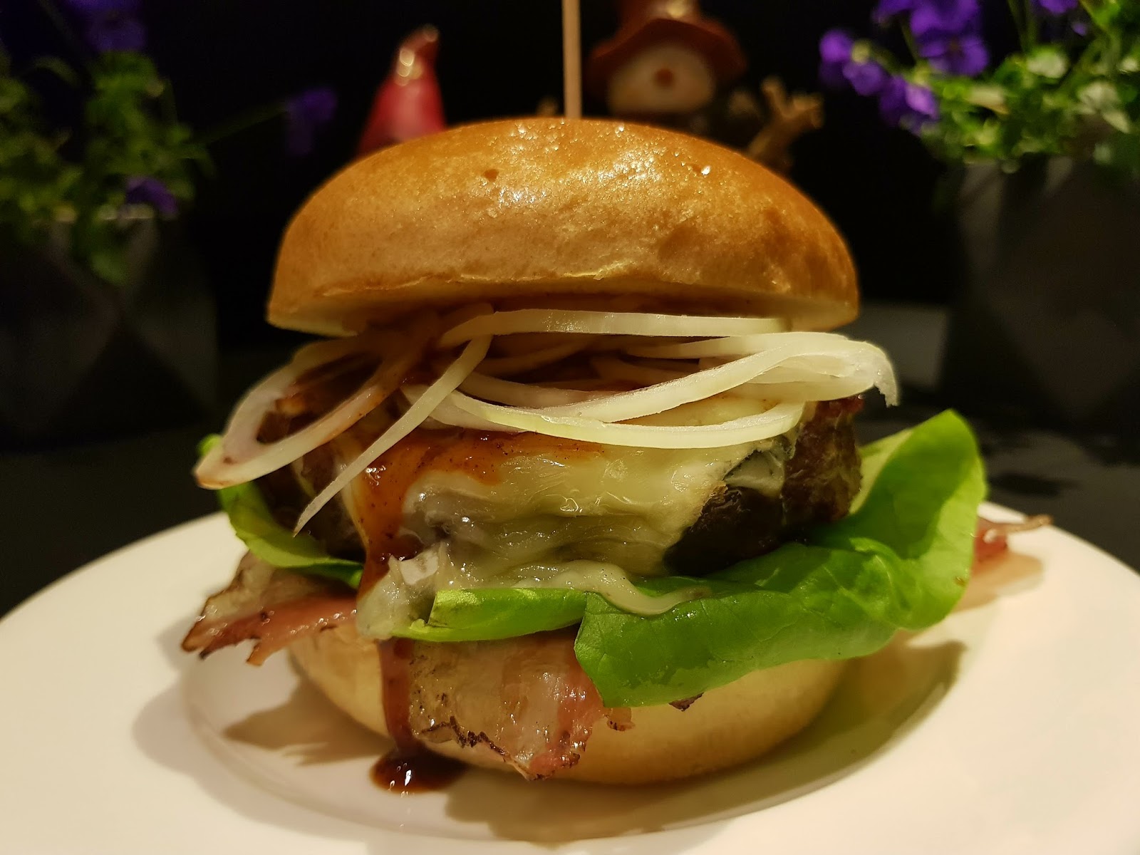 Jetzt nur noch zusammenbauen! Auf die untere Hälfte des Buns erstmal die BBQ Soße. Dann folgt der Pancetta und der Salat. Darüber das Patty mit dem geschmolzenen Gorgonzola. Jetzt noch ein paar Zwiebelringe und noch mehr BBQ Soße. Obere Hälfte des Buns drauf und fertig ist der Burger!