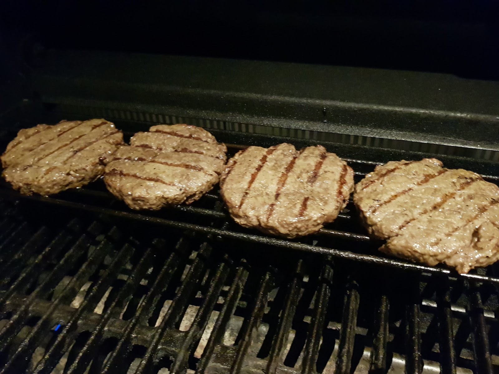 Jetzt geht es endlich an den Grill. Begonnen habe ich damit, den Pancetta knusprig und goldbraun zu grillen. Dieser wird dann erst mal zur Seite gestellt und es geht mit den Burgerpatties weiter. Also alle Brenner auf Vollgas und die Patties bei direkter, hoher Hitze von beiden Seiten 2 Minuten grillen. Anschließend wird die Temperatur auf ca. 120°C verringert und die Patties dürfen im indirekten Bereich Platz nehmen.