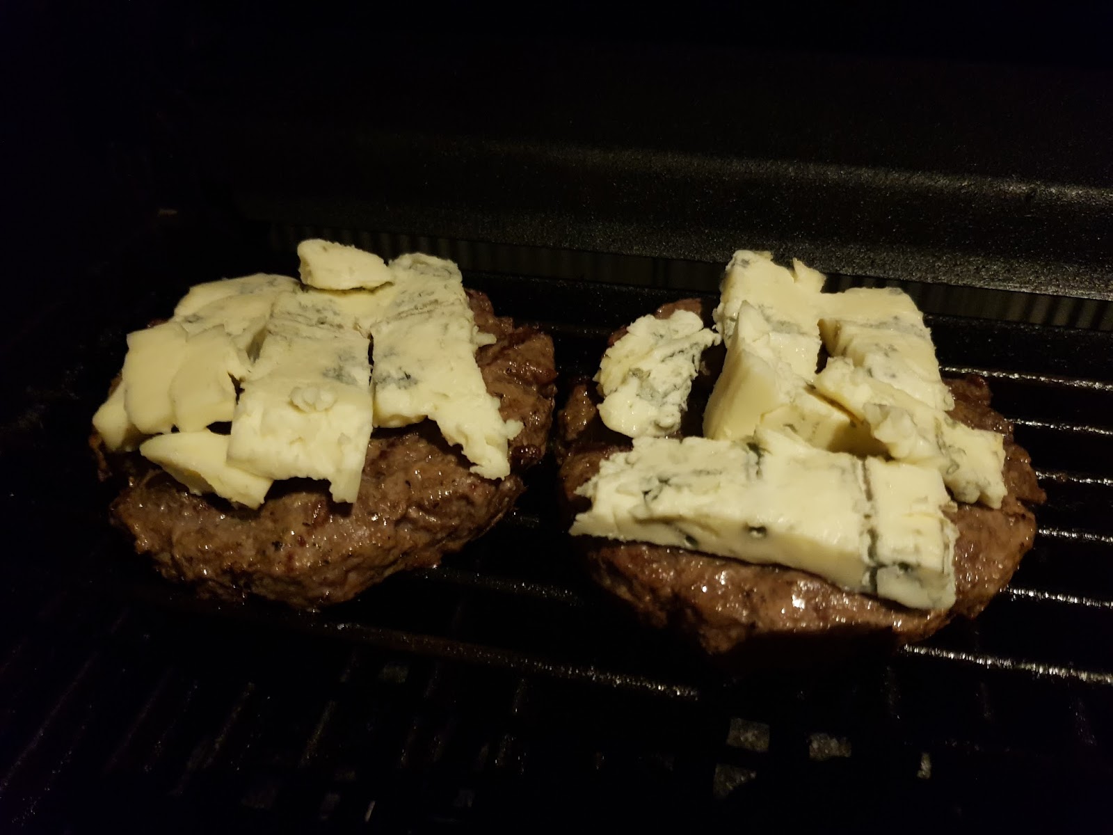 Damit die Burger später perfekt medium sind, kann ich nur empfehlen mit Hilfe eines Einstichthermometers die Kerntemperatur zu kontrollieren. Bei 50°C wird jedes Patty mit ca. 50g Gorgonzola belegt. Jetzt kann der Käse schmelzen. Bei 58°C sind die Burger fertig und können vom Grill genommen werden. Die letzten paar Minuten habe ich die Burgerbuns noch mit den Schnittflächen nach unten mit auf den Grill gelegt.